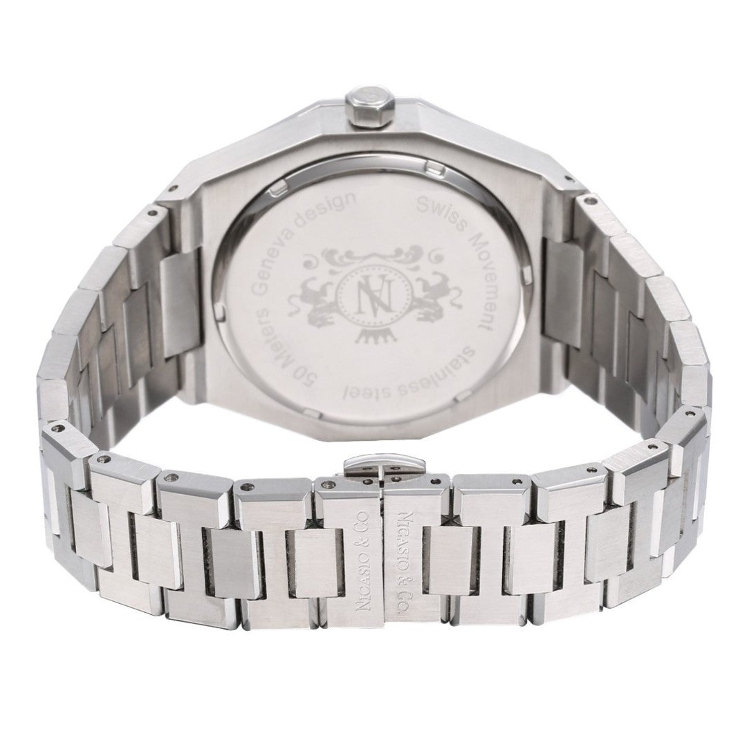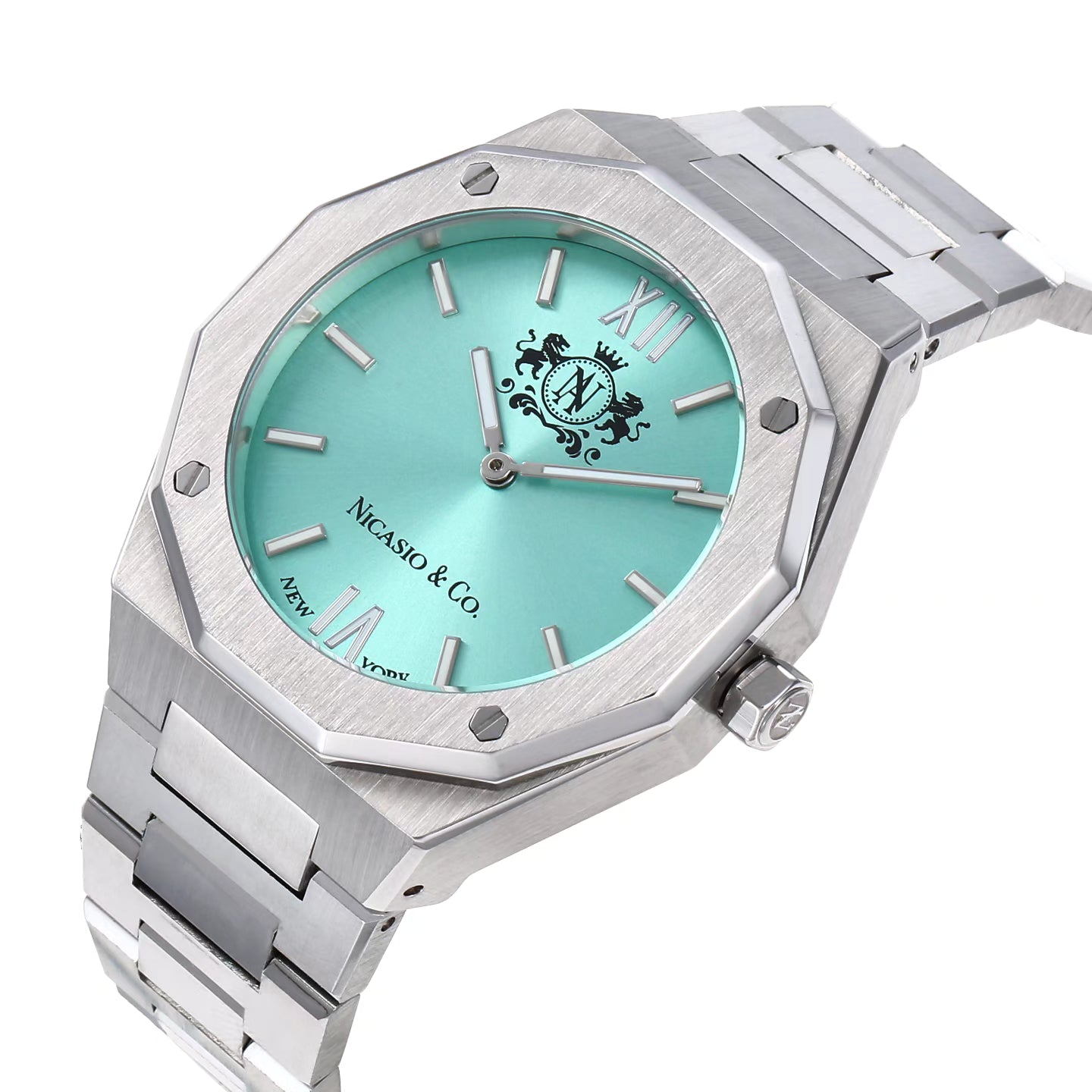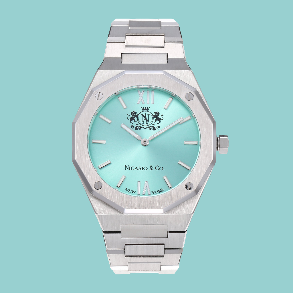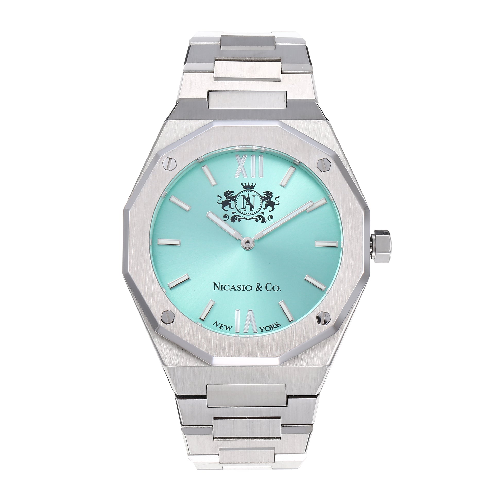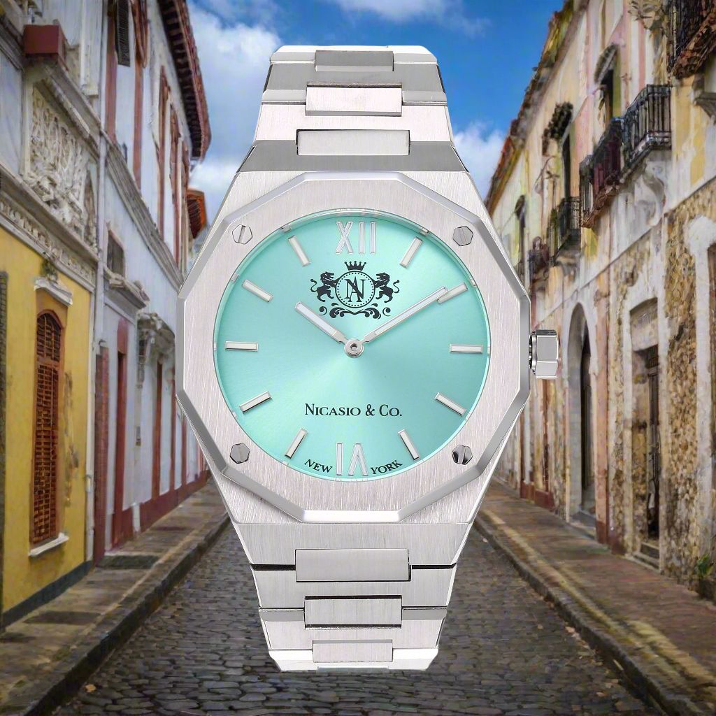 O Marbella Aqua Riviera é o carro-chefe da Nicasio & Co. O Marbella Aqua Riviera é um relógio luxuoso com uma luneta exclusiva de 12 lados (dodecagonal). A caixa e a pulseira de 42 mm são fabricadas em aço cirúrgico 316L premium e são movidas por um movimento suíço Ronda 762. O Marbella é ainda aprimorado com um cristal de safira, um aparelho lapidado com diamante e marcadores de horas com enchimento luminoso.